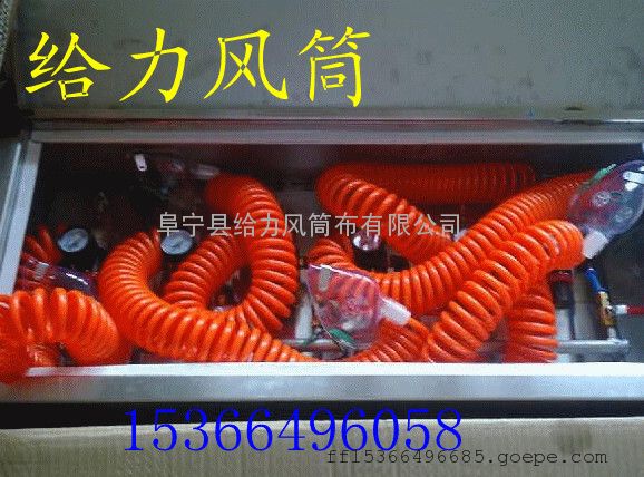 呼吸管较长,等待营救人员到来时,工人可以小范围内走动,工人在等待中可以静坐或睡觉。本产品解决了老式压风自救器在使用过程中,工人用头伸进风筒布袋遮挡视线,不能了解周围环境的变化,从而产生的情绪焦虑,影响自救等问题。发生矿难后,煤矿工人如果长时间使用老式压风自救装置,长时间呼吸没有过滤干净的空气,事后容易对身体尤其是肺部造成很大的伤害。此外,老式压风自救装置由于空气的声音没有调节,噪音过大,容易加大工人的负面情绪。